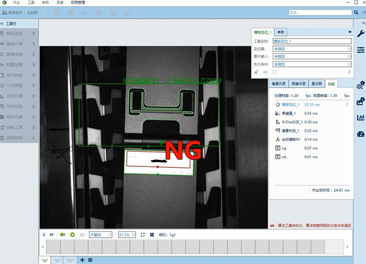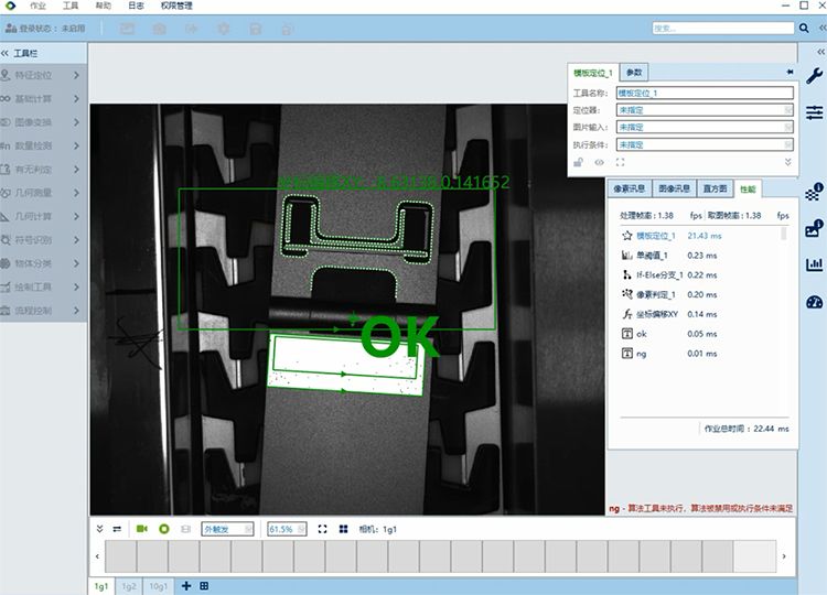 入料质量检测,检测出OK产品会引导机械手抓取到良品放料区,检测NG产品会引导机械手抓取到次品放料区。