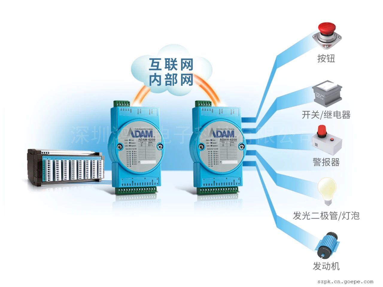 研华智能以太网I/O模块ADAM-6000系列包括模拟和数字输入/输出模块,通过创新互联网技术实现系统集成,从而灵活远程监控设备状态。ADAM-6000模块具点对点(P2P)和图形条件逻辑(GCL)功能,可作为独立测量、控制和自动化产品使用。通过直观图形化应用可快速完成配置无需额外控制器或编程工具。点对点连接-