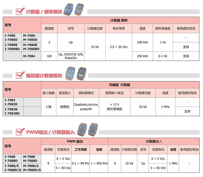 品牌:ICPDAS泓格 型号:I-7045D 电源电压:24 V 信息传输内容:数据 支持网络:/ 频段:/ MHz 发射功率:/ W 外形尺寸:/ mm 计数器输入 通道数 3轴 输入类型 隔离 编码模块 象限计数模式,顺时针/逆时针计数模式,脉冲/方向计数模式 隔离电压 输入电平5V 逻辑高电平: 3.5V~5V 逻辑低电平:0V~2V 外部带1KΩ电阻的12V输入 逻辑高电平: 5V~12V 逻辑低电平:0V~2V 外部带2KΩ电阻的24V输入 逻辑高电平:7V~24V 逻辑低电平:0V~2V *大计数 32bit *大计数频率 1MHz 内置计数器值断电备份 接口 接口 RS-485 格式 N, 8, 1 波特率 1200 ~ 115200bps LED显示 无 1路LED做电源/通讯指示用 — 电源 输入电压范围 10~30VDC 功耗 1.5W 工作环境 工作温度 -25 ~ 75°C 存储温度 -40 ~ 85°C 湿度 5 ~ 95%, 无冷凝 产品型号:M-7015P